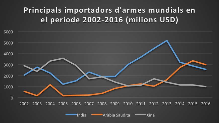 En esta línea de fortísimo incremento de su gasto en defensa, durante los últimos años Riad también ha multiplicado sus adquisiciones de armas en el exterior, convirtiéndose en el segundo mayor importador de armas mundial en el quinquenio 2012-2016 , y llegando a copar nada menos que el 8,2% de las compras mundiales de armamento, sólo por detrás de la India. Cabe destacar que durante este período el Estado español ha sido su tercer principal proveedor (4,2% del total de importaciones saudíes), sólo por detrás de EEUU y el Reino Unido. La tendencia alcista es tal que durante los últimos dos años (2015 y 2016) Riad ya ha superado la India como principal importador de armas del planeta, siendo estos dos junto con China los tres países que más armamento han importado durante los últimos quince años a nivel mundial.