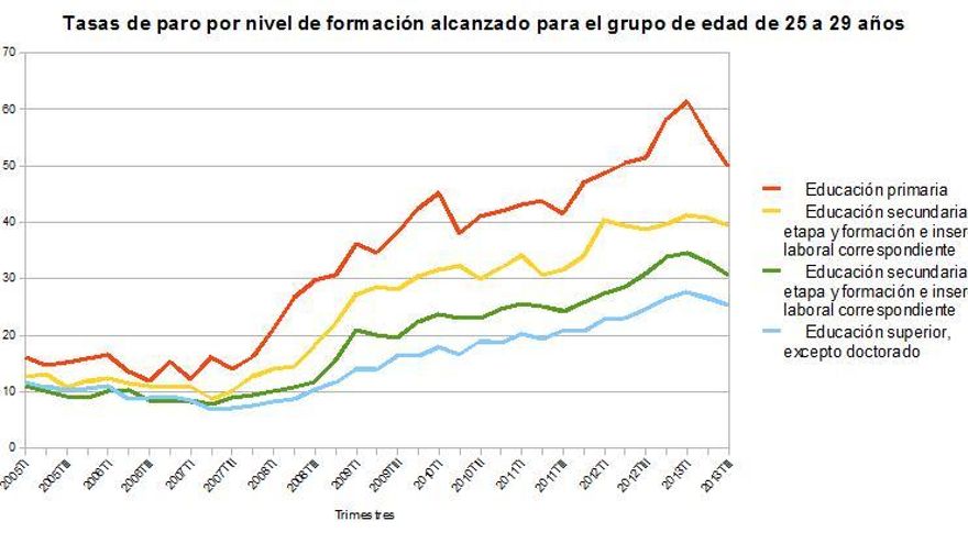 Las personas jóvenes que hoy terminan sus grados universitarios tienen dificultades para encontrar el primer trabajo y cuando lo hacen suele ser bastante precario. Los datos del Instituto Nacional de Estadística nos indican que en los últimos trimestres el comportamiento del paro para una persona joven universitaria de 25 años es muy parecido al de una persona mayor de 55 que no habría ido más allá de la primaria, tal como nos explicaba Lizoain. Es una clara evidencia de la dureza de la situación que estamos viviendo y hay que tener presente que no sólo afecta a las personas jóvenes. ¿Todo esto quiere decir que la educación ya no es un buen predictor de la futura trayectoria laboral? Probablemente lo es menos, pero no podemos decir que ya no lo sea. Entre las personas jóvenes, los datos nos dicen que teniendo estudios más avanzados más posibilidades de encontrar trabajo.