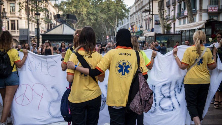 Ha sido así desde el inicio, cuando los profesionales han acudido entre aplausos a la manifestación –después de recibir un homenaje en el Ayuntamiento–, y también mucho después de que acabara la marcha. Grupos de bomberos y servicios de emergencias médicas han descendido hacia La Rambla entre aplausos de los ciudadanos que también se habían desplazado hasta allí. El mismo suelo por le que se desplazó la furgoneta que asesinó a 13 personas en La Rambla hace nueve días lo han pisado esta tarde unos profesionales alabados por muchas personas.