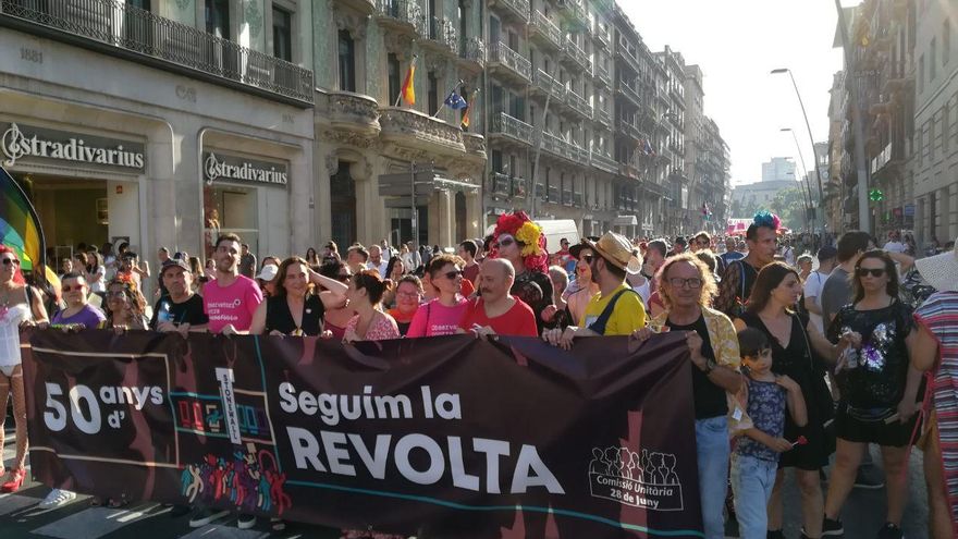 Medio siglo después de la revuelta de Stonewall siguen habiendo muchos motivos para la lucha LGTBI. Así lo ha reivindicado la manifestación que desde hace más de cuatro décadas recorre las calles del centro de Barcelona con motivo de la celebración del orgullo. Este año, bajo el lema “50 años de Stonewall, seguimos con la revolución”, la marcha ha querido denunciar que, pese a los avances legislativos, la discriminación sigue presente en el día a día del colectivo.
