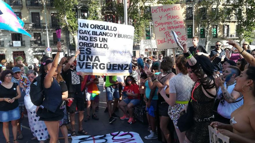 Miguel recuerda que la revuelta de Stonewall la iniciaron “mujeres, trans y pobres”, un espíritu que sí aprecia en la manifestación del centro Barcelona pero no en el Pride, el evento festivo que se celebra al mismo tiempo a unos kilómetros de distancia, en los alrededores de la plaza España de la capital catalana. Este mexicano hace suyas las palabras de un cartel de las decenas que se levantan en la plaza: “Un orgullo gay, blanco y burgués, no es un orgullo, es una vergüenza”.