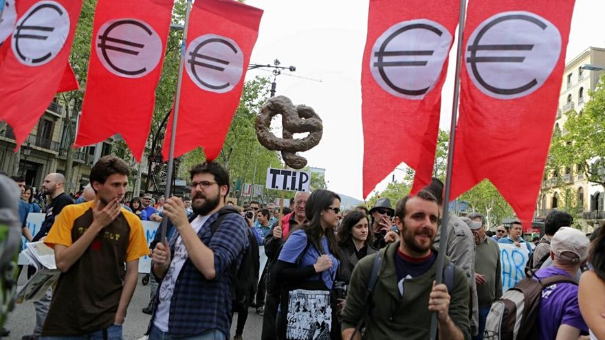 Miles de personas de diversos puntos de Catalunya se han manifestado este sábado en el centro de Barcelona contra el TTIP, las siglas en inglés con las que es conocido el Acuerdo Transatlántico sobre Comercio e Inversión. La marcha, que ha reunido a diversos colectivos, desde asambleas de pueblos, ciudades y barrios surgidas del 15-M y grupos como la Plataforma Auditoría Ciudadana de la Deuda, hasta sindicatos y partidos de izquierdas, estaba encabezada por tres tractores que marcaban el ritmo de la manifestación desde el Paseo de Gracia a la plaza Sant Jaume.