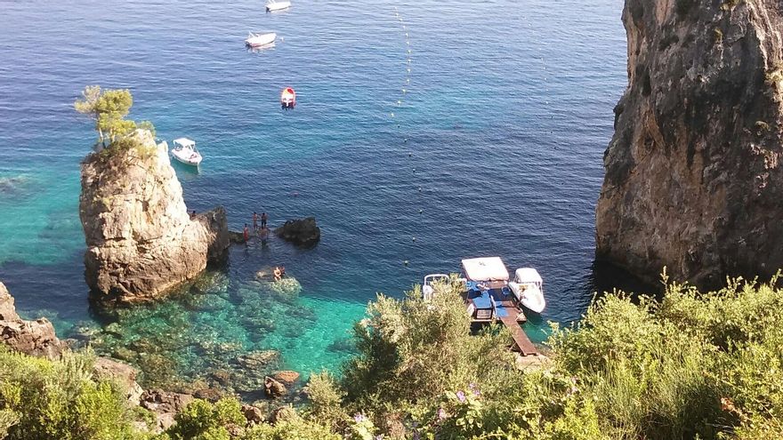 I deixem per al final Palaiokastritsa, sens dubte una de les perles no només de Corfú, sinó de tota Grècia. Aquest és un dels llocs de l'illa que pugnen per ser el punt on va desembacar Ulisses. Si va ser així, deuria quedar bocabadat per la bellesa natural d'aquest paratge, envoltat de muntanyes on el verd de la vegetació xoca literalment amb el mar. Paleokastritsa està conformada per una sèrie de petites penínsules que s'endinsen al mar formant espectaculars platges de sorra. L'aigua del mar és rabiosament cristal·lina, d'un color “blau papallona” com descriu Gerald Durrell. Molt recomanable llogar una petita embarcació per conèixer aquest paradís, que convida a capbussar-se constantment en les seves aigües. Allà és on realment un arriba a comprendre perquè a Corfú l'anomenen l'illa maragda.