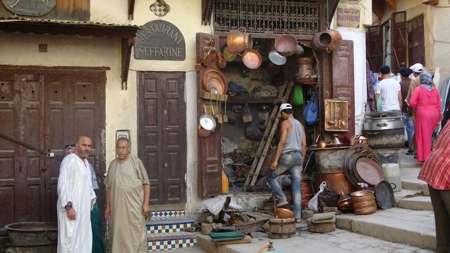 Pero perderse por Fez-El-Bali no tiene porque ser un infortunio, y sí una oportunidad para encauzar, de retruque, un interesante itinerario monumental. Situada en la parte central de la Medina, la plaza Seffarine es el epicentro de uno de los oficios que han forjado la vida social y económica fasí como es el de la calderería. Allí uno aún puede asistir a la forja con yunque de platas y distintos objetos metálicos por parte de los pocos artesanos caldereros que aún ejercen. Cerca de la plaza Sefarinne encontramos otro enclave interesante del callejero que compone la Medina; la plaza Nejjarine, lugar en el que se ubica el Museo de Arte y Artesanía de Madera, una fonda que data del siglo XVIII y que atesora una gran colección de objetos tradicionales tallados a mano por los maestros artesanos de Fez. Un edificio de gran belleza que constituye una obra de arte en si misma.