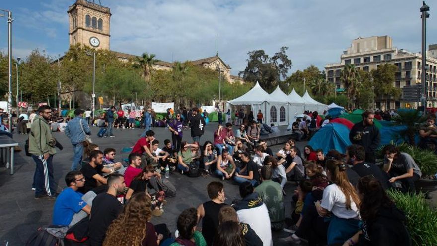 Son ya unos 500 los jóvenes que, desde el pasado miércoles, ocupan la plaza Universitat, un céntrico emplazamiento de la ciudad situado a pocos metros de plaza Catalunya, el lugar donde se instaló el movimiento 15-M en la capital catalana hace ocho años. El catalizador de este nuevo asentamiento ha sido la sentencia del Tribunal Supremo a los líderes independentistas y las actuaciones policiales contra las protestas posteriores. A día de hoy, sin embargo, los acampados reconocen que la protesta va mucho más allá del independentismo: el trasfondo vuelve a ser la crisis y la falta de oportunidades.