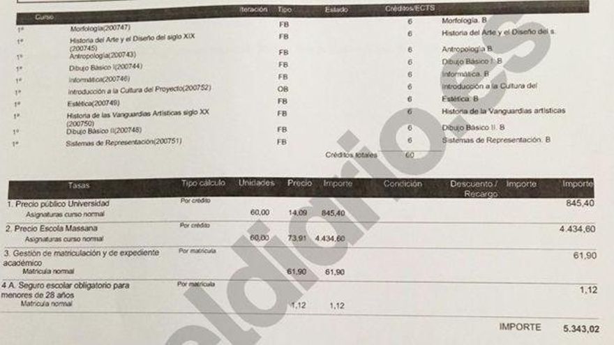 Por ejemplo, el primer curso, en 2010, un estudiante cualquiera abonó 5.343 euros, de los que 845,40 euros correspondían al precio público. Este último montante, un 15% del total, es lo único que asumían los docentes. Como fueron los años en los que CiU aplicó el 'tasazo' que disparó el precio de los grados universitarios hasta en un 66%, este grupo acabó pagando unos 1.500 euros por el precio público en los años sucesivos, lo que llegó a suponer un 25% del total.