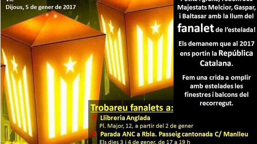 “Es convida a tothom, especialment els més petits, a il·luminar el camí de Ses Majestats amb el fanalet de l'estelada”, assenyala un comunicat de l'ANC d'Osona. També animen a omplir amb banderes independentistes les finestres i els balcons del recorregut de la cavalcada de la Nit de Reis.