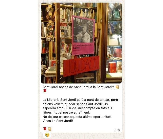 En estas circunstancias, Riera se dio por vencida y se propuso cerrar la librería, no sin antes lanzar durante la pasada diada de Sant Jordi un mensaje de ayuda por WhatsApp que corrió por toda la ciudad y en el que llamaba a los clientes a vaciar las existencias. El resultado fueron largas colas toda la jornada a las puertas de la librería que aparecieron en numerosos medios de comunicación. Tras el vaciado de existencias, Riera cerró, pero no se olvidó: “Comencé tantear a diferentes personas que sabía que podían hacerse cargo, quería mantener la memoria de Josep”.