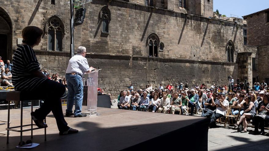 En la plaza del Rei tocaba hablar de memoria y quién mejor para hacerlo que el historiador Josep Fontana, que cierra la candidatura de Colau de forma simbólica. Fontana ha recordado su vida en el barrio: los bombardeos de la aviación italiana sobre Barcelona, la destrucción de la librería de su padre, el colmado del señor Martí donde su madre compraba la comida, las tiendas de juguetes hoy desaparecidas y las noches en los refugios antiaéreos. “Ahora me parece que llego a un decorado preparado para recibir turistas donde los vecinos parecen realquilados”, ha lamentado.