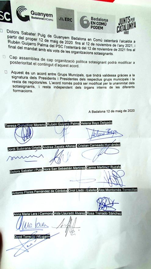 Finalmente los concejales del PSC han llegado al pleno con un documento firmado por varios miembros de otras formaciones, como ERC y Catalunya en Comú, pero no así de los de Guanyem, por lo que han decidido no retirar su candidatura. La composición del ayuntamiento de Badalona exigía un acuerdo de Guanyem, ERC, PSC, los 'comuns' y JxCat, sin excepción de ninguno, para formar una mayoría contra el PP.