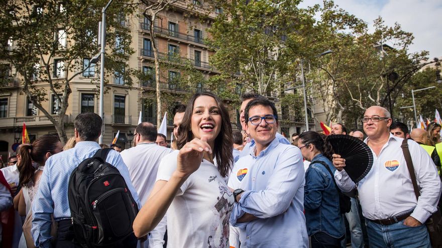 Siguiente tema: Mediterráneo, la canción que Joan Manuel Serrat pidió que no se utilizara políticamente. La cabecera hace entrada en la plaza con la pancarta de Societat Civil Catalana y el resto de plataformas antiindependentistas. En primera línea, Inés Arrimadas, líder de la oposición en Cataluña junto a la plana mayor de su partido, con Fernando de Páramo al lado.