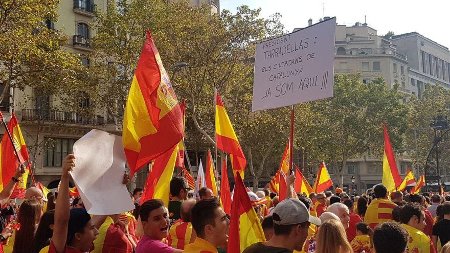 En la Plaza de Catalunya empieza a agolparse gente, pero hay espacio de sobra para caminar. Los altavoces reproducen grandes éxitos en castellano: Miguel Ríos, Los Secretos, Calamaro... y el animador intenta que la fiesta no decaiga: “Os voy a pedir que me ayudéis y os agachéis en el suelo, así como os quiere Puigdemont”. En ese momento sube la música y grita: “En pie, si eres español; en pie, si eres español, en pie, si eres español. España unida jamás será vencida. Viva España, visca Cataluña”. La coreografía se cierra con una ovación que no llega a serlo del todo.