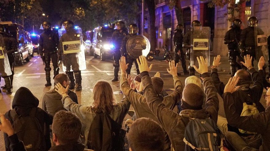 A partir de ese momento, los manifestantes han quedado repartidos por las calles del Eixample derecha, donde han apilado basura y material para hacer barricadas y han prendido fuego a algunas de ellas. Los Mossos han intervenido entonces, de nuevo mediante carruseles y con disparos de material antidisturbios desde dentro de los vehículos, algunos de los cuales conducían con las puertas abiertas o entreabiertas.