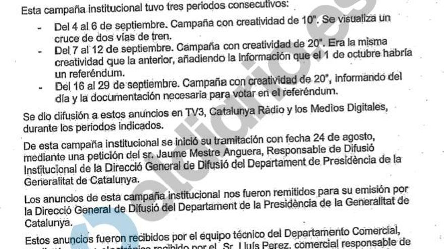 Pese a ser el responsable de la publicidad institucional del Govern, Mestre ha respondido con sucesivos “no lo sé” y “no lo conozco” a las preguntas del fiscal sobre el anuncio del 1-O. Moreno se ha sacado entonces un as de debajo la puñeta: la presidenta en funciones de la corporación de los medios públicos catalanes, Núria Llorach, señaló a Mestre como el responsable de la Generalitat que pidió directamente a TV3 y Catalunya Ràdio que emitieran el anuncio después de que dos empresas renunciaran a elaborarlo y a comercializarlo. Así consta en el requerimiento que Llorach respondió al juzgado de instrucción 13 de Barcelona a finales de 2017 y que acompaña a esta información.