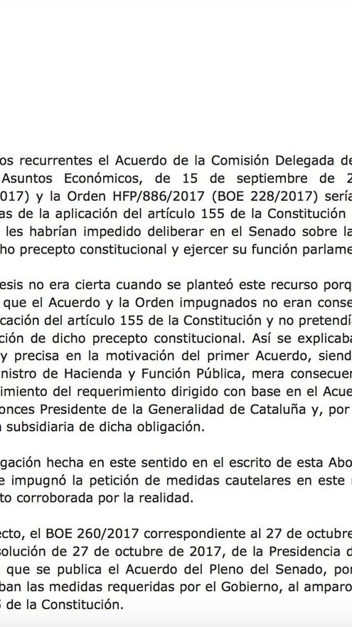 Tras este recurso los acontecimientos se atropellan en Catalunya, con el referéndum, el encarcelamiento de los 'Jordis' y la declaración de independencia del día 27 de octubre, llegando ese mismo día la aplicación del artículo 155 en el Senado. Sin embargo, en la propuesta de medidas de intervención política que envía el Gobierno de Rajoy para ser aprobada en la Cámara Alta no figuran las medidas de intervención económica tomadas en septiembre, lo que revela el deseo de Montoro de mantenerlas más allá del 155.