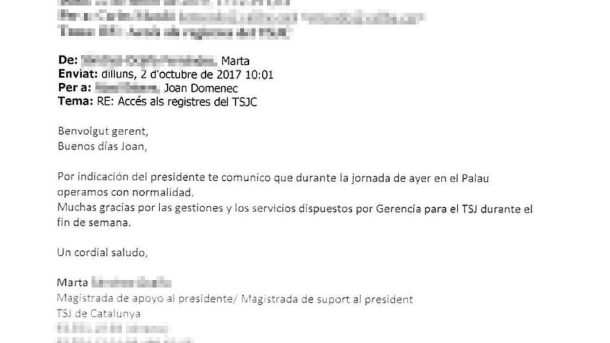 “Por indicación del presidente te comunicó que durante la jornada de ayer en el Palau operamos con normalidad”, trasladó la entonces magistrada de apoyo de Barrientos al departamento de Justicia de la Generalitat, por medio del responsable de la gerencia territorial de Barcelona, el día siguiente al referéndum. “Muchas gracias por las gestiones y los servicios dispuestos por la Gerencia para el TSJ durante el fin de semana”, se añade.