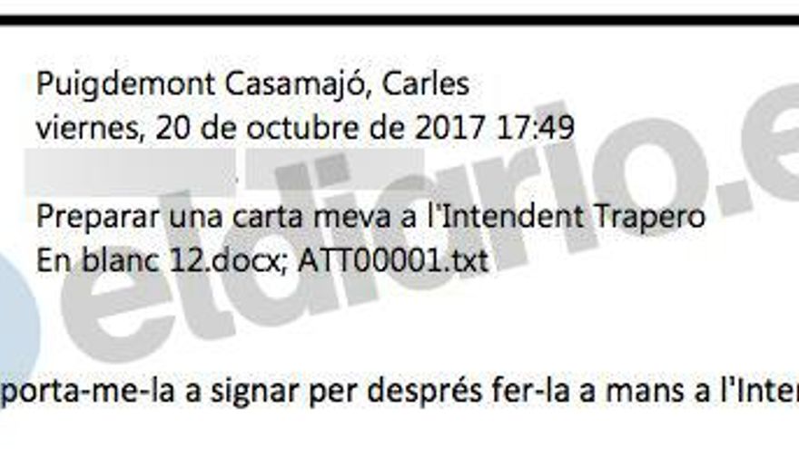 Carles Puigdemont quiso agradecer a Josep Lluís Trapero su labor como máximo responsable policial de los Mossos d'Esquadra y buscó una fórmula discreta para no crearle más problemas de los que ya tenía. El expresident optó por escribirle una carta el 20 de octubre del año pasado, cuatro días después de que el exmajor de los Mossos hubiese declarado en la Audiencia Nacional como imputado por sedición y pidió a su secretaria que fuese entregada en mano.
