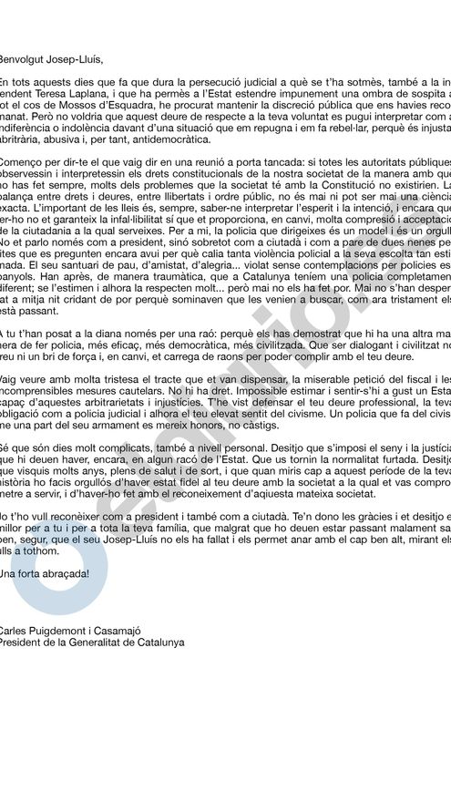 La carta de Puigdemont está escrita en un tono personal y de agradecimiento a Trapero