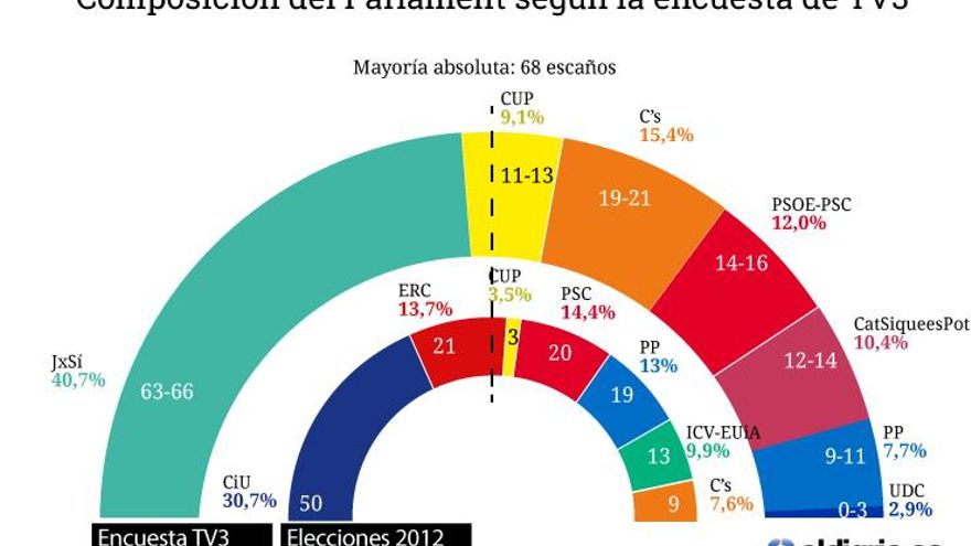 Junts pel Sí ha ganado las elecciones catalanas, según el sondeo elaborado a pie de urna para TV3. La candidatura de Artur Mas obtendría entre 63 y 66 escaños y necesitaría el apoyo de la CUP para gobernar. De confirmarse el resultado del sondeo, Artur Mas estaría desde hoy en manos de Antonio Baños. Los partidos independentistas se asoman al 50% de los votos. La suma de Junts pel Sí (40,7%) y la CUP (9,1%) rozan esa cifra y se quedan en el 49,8% del total.