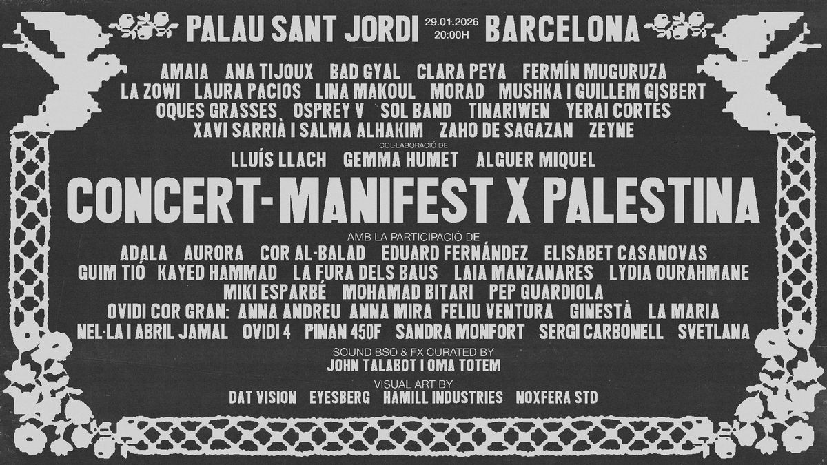 El cartel del concierto nada tenía que envidiar al de los grandes festivales. Sin contar con Rosalía, la lista ya incluía a Amaia, Morad, Fermín Muguruza, Oques Grasses, Ana Tijoux, Lluís Llach, Bad Gyal, Clara Peya, La Zowi, Guillem Gisbert, Mushka... Entre las voces palestinas, están Zeyne o Lina Makoul. Todos los beneficios del concierto se destinarán a apoyar los proyectos culturales del Palestinian Performing Arts Network, que financia y promueve actividades en diferentes zonas del territorio palestino.