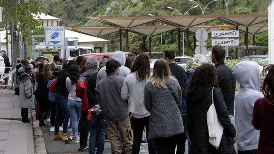 Dos horas y media ha tenido que esperar Anne, una mujer de 74 años, para comprarse cuatro cartones de Marlboro. Ha hecho cola junto a cientos de franceses que, desde este lunes, han acudido en masa a la localidad fronteriza de El Pertús para comprar sobre todo tabaco y alcohol en la parte del núcleo urbano que pertenece a España, al término municipal de La Jonquera. Tales han sido las aglomeraciones desde el lunes, cuando Francia permitió a sus ciudadanos desplazarse a 100 kilómetros, que la Gendarmerie ha optado por escalonar los accesos al pueblo.