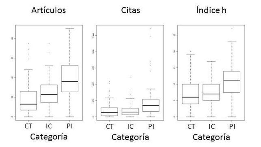 En un primer análisis podemos comparar los distintos índices de productividad en función de la categoría profesional del investigador. Los investigadores del CSIC se dividen, esencialmente, en tres eslabones. En orden ascendente: Científico Titular (CT), Investigador Científico (IC) y Profesor de Investigación (PI). Como referencia, la primera categoría equivale a profesor titular de universidad y la tercera a catedrático de universidad. Hay, además, algunos investigadores con otras categorías dispares a los que ignoramos en este análisis por simplicidad.