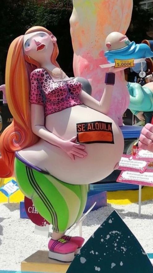 En concreto, el levantado por la Foguera Sèneca Autobusos en el que se distinguía a una madre embarazada con un cartel de “Se alquila” en el vientre y sosteniendo en una bandeja un bebé con el precio de 5.000 euros.