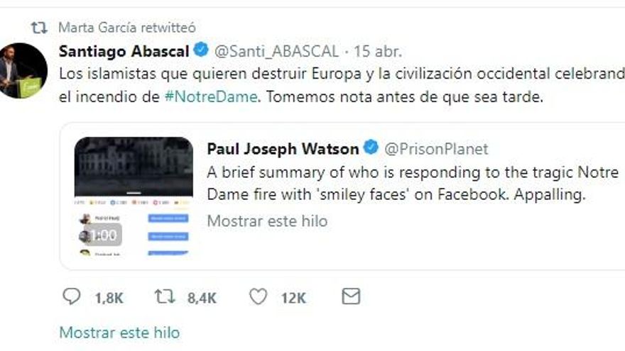 García, con la que ha tratado este medio de hablar por varias vías sin éxito, también comparte mensajes del líder Santiago Abascal con evidente contenido islamófobo, como el que retuiteó el 15 de abril acerca del incendio de Notre Dame: “Los islamistas que quieren destruir Europa y la civilización occidental celebrando el incendio de #NotreDame. Tomemos nota antes de que sea tarde”, se podía leer.