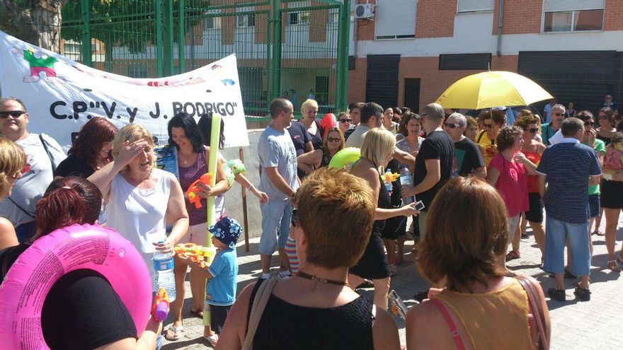 Una situación similar se ha vivido en el colegio Victoria y Joaquín Rodrigo del Puerto de Sagunto (Valencia), donde padres, alumnos y profesores se concentraban a la salida de los niños del centro para protestar y 'mojarse', literalmente, contra las altas temperaturas en las aulas, que han obligado a algunos profesores a trasladar las clases al patio para combatir las elevadas temperaturas, de hasta 35 grados.