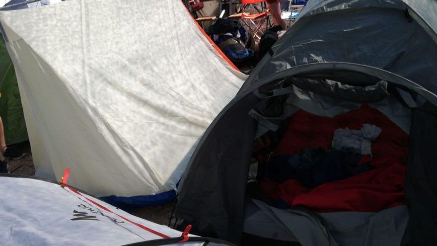 A esa hora en cambio los espacios para acampar ya estaban abarrotándose, sobretodo los del Arenal, más cercanos a la zona de conciertos y la playa. En el Arenal Sound hay cinco zonas de cámping, dos en el área conocida como Arenal, otra mucho más grande en la Malvarrosa y dos glampings –cámpings más exclusivos–, uno en cada uno de los recintos. En total un espacio donde pueden acampar entre 35.000 y 40.000 personas según la organización. Pero el martes a mediodía ya habían acampado 30.000 y empezaron las primeras quejas. Una joven de 20 años que estudia en la Universidad de Granada y que había llegado con dos amigas desde Andalucía se quejaba a eldiario.es que aunque a las 3 de la madrugada les habían instado a dejar pasillos de seguridad, a las 8 de la mañana les despertó uno de los acomodadores del cámping para que movieran la tienda e hicieran espacio a los recién llegados. El resultado, unas tiendas están pegadas a otras sin espacio de paso.