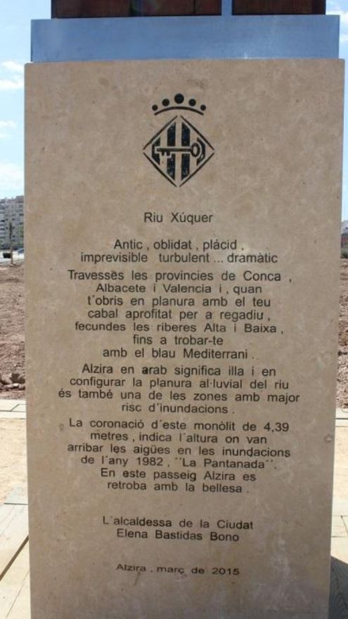 El monumento inaugurado el 28 de marzo mide 4,39 metros, la altura a la que, como recuerda el mismo monolito, llegó el nivel del agua en octubre de 1982 con la riada del Xúquer por la pantanada de Tous. La inscripción realizada sobre mármol contiene un buen número de faltas de ortografía que, según el ayuntamiento no se puede atribuir al Servei Alzireny de Promoció i Ús del Valencià porque este “realizó las correcciones oportunas al texto original realizado por la Oficina Técnica”.