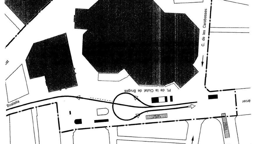 Según estos criterios, se debe crear un espacio para que los buses de dos líneas de la EMT puedan hacer un giro de 180 grados a partir de la calle Juan de Vilarrasa, lo más lejos posible de la plaza Ciudad de Brujas, para garantizar el mayor espacio peatonal posible, algo que en la actualidad ya sucede.