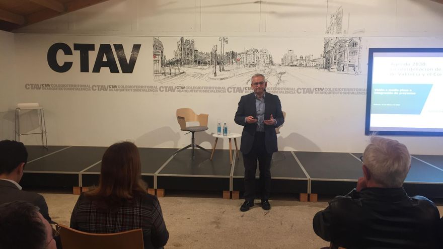 El comisionado del Gobierno para la coordinación del Corredor Mediterráneo, Josep Vicent Boira, protagonizó este martes por la tarde la conferencia 'Agenda 2030, la reordenación ferroviaria de València y el Corredor Mediterráneo: el túnel pasante y otros', organizada por el Colegio Territorial de Arquitectos de València y presentada por el presidente de la entidad, Mariano Bolant.