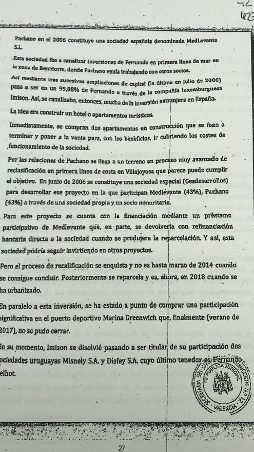 También se reflejan en el documento las ampliaciones de capital en Imisión International, la constitución de Gesdesarrollos -otra sociedad para llevar a cabo inversiones inmobiliarias en la Vila-Joiosa (Alicante)- y la disolución de Imision, “pasando a ser titular de su participación las luxemburguesas Misnely y Disfey cuyo último tenedor es Fernando Belhot”, el testaferro uruguayo.