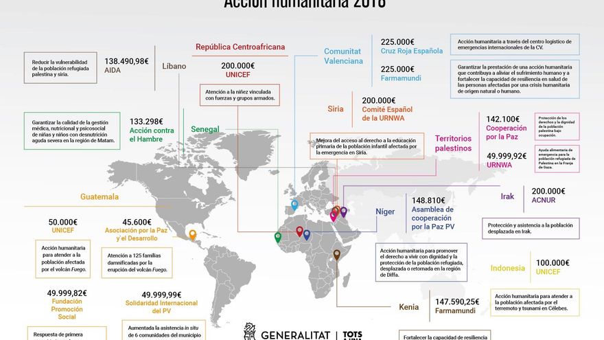 En 2018, cuyos mapas de proyectos en todo el mundo se reproducen en esta información, con fondos de la dirección general de Cooperación de la Conselleria de Transparencia se han realizado 97 proyectos, de cooperación, acción humanitaria y Eduación para la Ciudadanía Global.