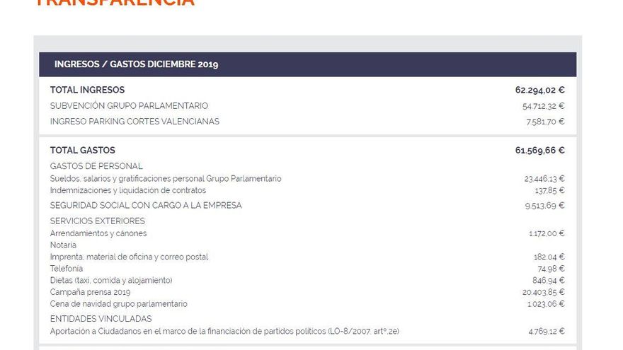 Ciudadanos es el único partido que detalla sus gastos del grupo parlamentario de forma pública. El partido recibe 54.700 euros mensuales de las Corts Valencianes de los que gasta más de 30.000 euros en personal, con 12 trabajadores, contando la tributación a la Seguridad Social. El partido gastó en diciembre 20.000 euros en una campaña publicitaria y envía periódicamente al partido 4.500 euros en cumplimiento de la ley de financiación de partidos. El grupo parlamentario abrió sus cuentas el pasado septiembre tras denunciar la opacidad de la cámara valenciana.