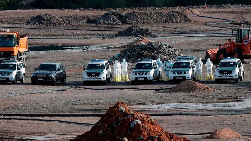 Alrededor de 30 guardias civiles, además del personal de la Entidad Metropolitana de Tratamiento de Residuos, trabajan junto a perros adiestrados desde primera hora de la mañana de este jueves en la búsqueda del cuerpo de Marta Calvo en el vertedero del municipio valenciano de Dos Aguas.