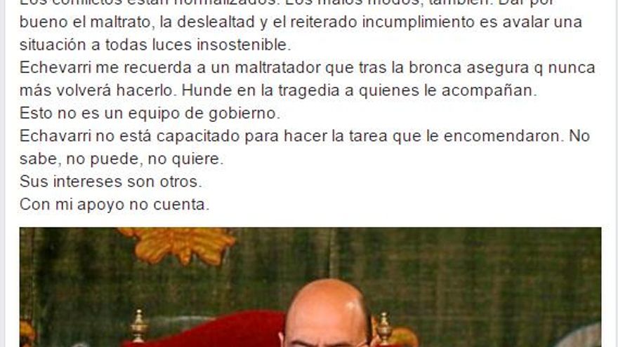 Quiñonero responde asegurando que: “Los conflictos estan normalizados. Los malos modos, también. Dar por bueno el maltrato, la deslealtad y el reiterado incumplimiento es avalar una situación a todas luces insostenible”, al tiempo que acusa a Echávarri de hundir “en la tragedia a quienes le acompañan. Esto no es un equipo de gobierno”. Y concluye su comentario sentenciando que el socialista “no está capacitado para hacer la tarea que le encomendaron. No sabe, no puede, no quiere. Sus intereses son otros. Con mi apoyo no cuenta”.