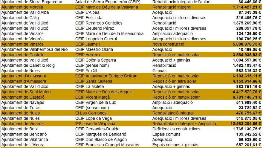 Para ello, la Generalitat Valenciana presentó un plan de choque (Edificant) que prevé la construcción de 200 colegios e institutos, así como la reforma de otros 500. Esta iniciativa, a desarrollar entre 2018 y 2022, prevé una inversión superior a los 700 millones de euros y contempla la colaboración con los ayuntamientos -la Conselleria de Educación asume el coste total de las infraestructuras y los consistorios que se adhieren al plan se encargan de la tramitación para la construcción-.