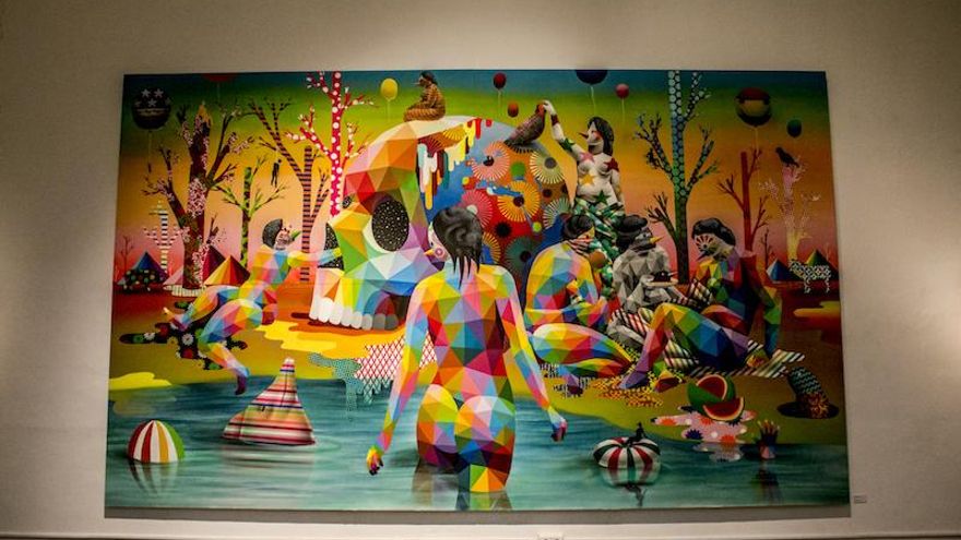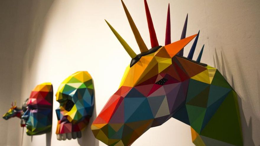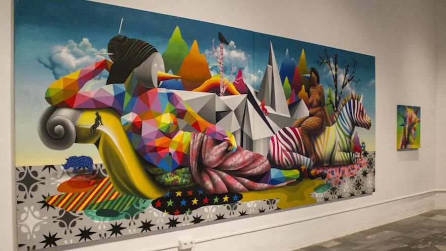 Okuda San Miguel exhibe 'The *Multicolored Equilibrium Between Animals and Humans', un centenar de piezas que componen la retrospectiva más grande de este artista hasta ahora. La muestra integra las técnicas de calle de Okuda: stèncils, spray, trazos de brocha de pared... con textiles, maderas, esculturas e instalaciones. Todo impregnado de una estética pop muy contemporánea y absolutamente llamativa donde se mezclan el existencialismo postmodernista, la crítica a la industria cultural, el sexo, la relación con la natura o el consumismo.