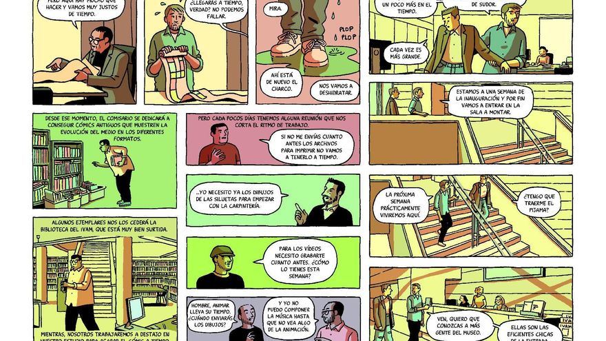 El cómic desgrana cómo surgió el proyecto de la exposición, las reuniones de Paco Roca con el director José Miguel G. Cortés y el comisario Álvaro Pons, explicaciones sobre las funciones de los distintos departamentos del museo o anécdotas de los visitantes, en un homenaje del ilustrador valenciano por el 30º aniversario del IVAM. Las viñetas también recrean espacios singulares del museo, como las cámaras que custodian las obras de arte o los almacenes de tránsito de las piezas.