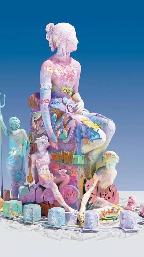 “El arte clásico estaba un poco intocable, y nosotros quisimos retomar esa elegancia, sus formas bellas y llevarlas a nuestro terreno del grafitti, por eso siempre hay un juego de transparencias, de color y le damos otra vida. Cogemos lo bueno de sus mitos y sus proporciones y los actualizamos a nuestros días”, explica Álvaro Hernández, Avo, siempre con su gorra de ala ancha que delata su adscripción a la cultura urbana. Estudió diseño gráfico, una disciplina que le aportó orden frente a la espontaneidad de Juan Antonio Sánchez, Pichi, formado en Bellas Artes. Entre los dos han desarrollado una habilidad para crear relaciones únicas entre arquitectura, escultura y contextos sociales, con un enfoque performativo e innovador.