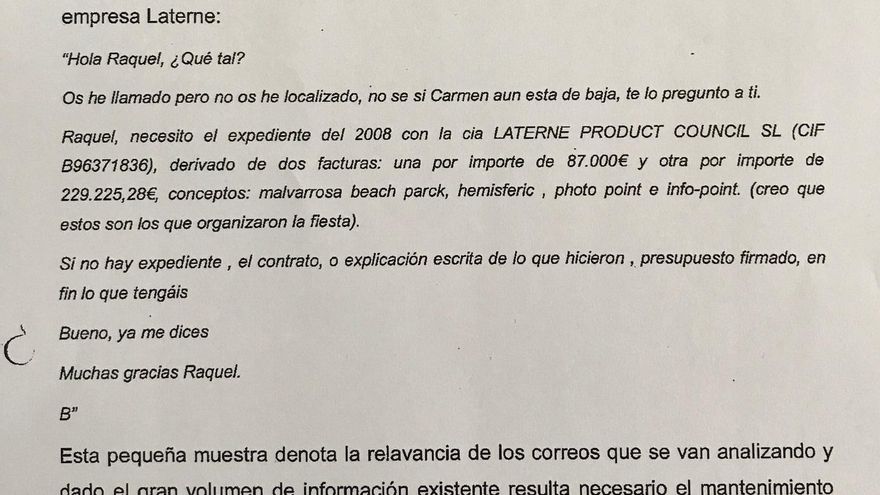 Ante tal volumen documentación, Anticorrupción había propuesto a la titular del juzgado de Instrucción número 2 de València que prorrogara el secreto de sumario del Caso Valmor, aunque ésta se negó y decretó su alzamiento la pasada semana. Así, entre los cinco tomos en poder de eldiario.es, aparece un informe del fiscal del caso en el que revela que la exdirectora del Circuit del Motor Blanca Tomás (empresa pública de la Generalitat) se interesa por dos contratos de 2008 con la empresa Laterne, la firma instrumental que utilizó el PP de Rita Barberá para presuntamente financiar de manera ilegal su campaña electoral en 2007.