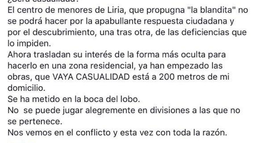 Por su parte, el alcalde socialista de Llíria ha puesto todas las facilidades para la apertura del centro de menores, pese a las concentraciones de vecinos en su contra. En la primera convocatoria en el centro del municipio a la que asistieron unos 150 vecinos -Llíria tiene casi 24.000- estuvo presente José Luis Roberto junto a otros miembros de España 2000, según han confirmado fuentes policiales. Ese día algunos de los manifestantes llegaron a increpar al alcalde Manuel Civera.