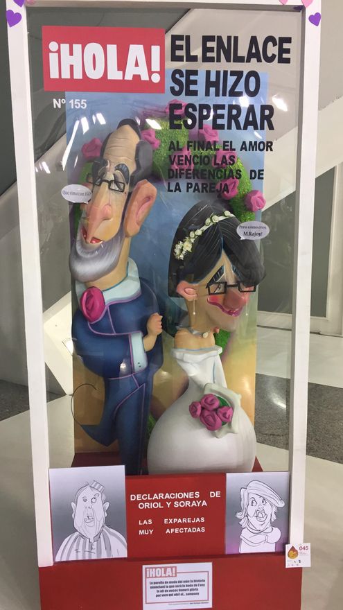 En una de ellas, obra del artista José Enrique Giménez para la falla Sagunto Padre Urbano, se puede ver en la portada de una conocida revista del corazón a Puigdemont de novia dándole el sí quiero a Rajoy.