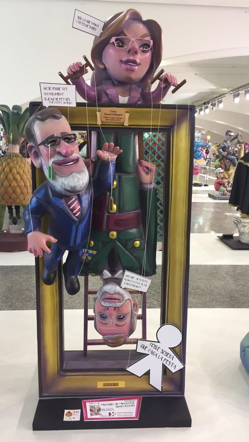 En otra, el artista Xavi Herrero pone a Sáenz de Santamaría moviendo los hilos del Gobierno, con Rajoy como marioneta el rey Felipe VI boca abajo, en una escena para la falla Marqués de Montortal Berni i Català.