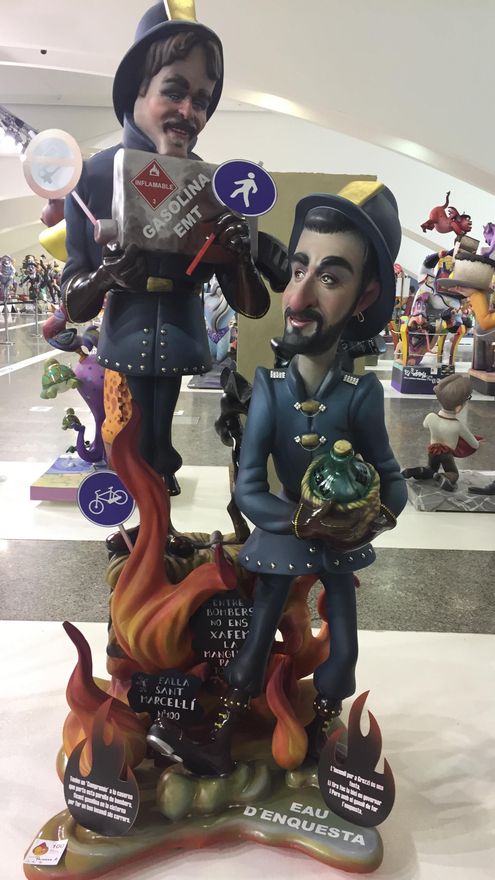 La falla de Sant Marcel-lí ironiza poniendo de bomberos a los ediles Pere Fuset y Giuseppe Grezzi tratando de apagar con gasolina los incendios que ellos mismos provocan.