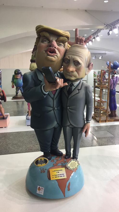 Los líderes mundiales Donald Trump y Vladimir Putin se hacen un selfie 'con sorpresa', obra del artista Vicente Herrando para la falla Barrio de San Isidro.