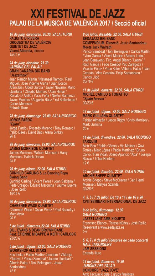 Como cabeza de cartel y en exclusiva en España, el público podrá disfrutar el 15 de julio del saxofonista Archie Shepp y su cuarteto, gran protagonista del jazz moderno. Otro de los grandes nombres que figuran en el cartel son Paquito d'Rivera y la fusión de jazz y flamenco de Michel Camilo y Tomatito, ambos a propuesta del Palau, según han destacado su presidenta, Gloria Tello, y su director, Vicent Ros.