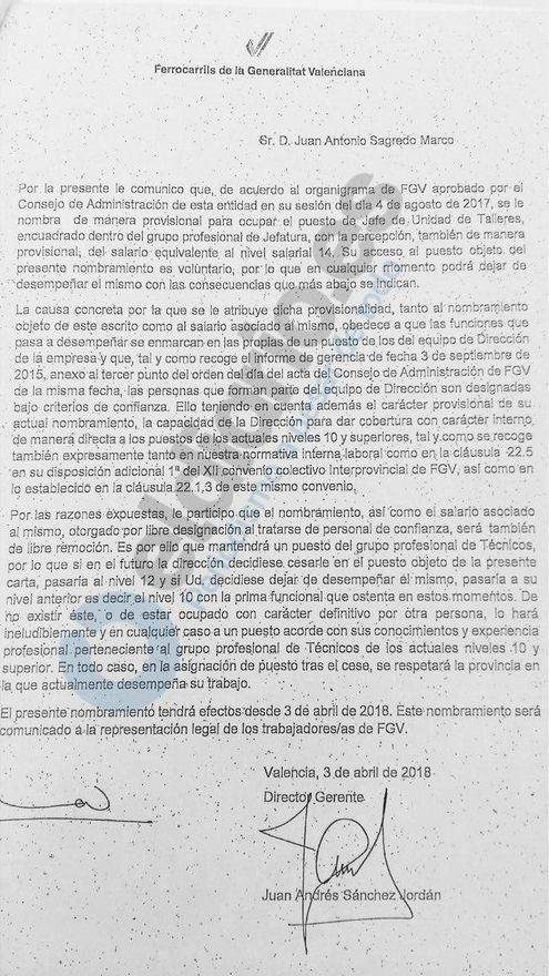 Este trato dispensado al alcalde de Paterna se evidencia más particular cuando se compara con el otro alto cargo nombrado por FGV y que venía de Paterna. Se trata de Francisco José García Martínez, exdirector de recursos humanos de Gestión y Servicios de Paterna S.L.U (Gespa), ahora jefe del área de gestión de personal de FGV, y quien informó favorablemente del ascenso de categoría profesional del alcalde en Ferrocarrils de la Generalitat.